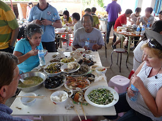 Lunch: a whole bunch of the most amazinly fresh and diverse seafood you can imagine. Three or four Chinese women did all the cooking for the whole group in enormous woks that are commonly used in the rural parts of the country.